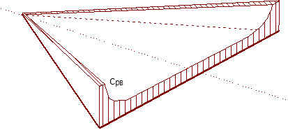 кромка треугольного крыла дозвуковая. У передней кромки треугольного крыла имеют место наличие больших возмущенных скоростей. Для тонкой пластины местная скорость у носка стремится к ¥. Поэтому разряжения здесь весьма значительны (см. рис.2.74). Далее к середине крыла возмущенное давление уменьшается, разряжение падает.