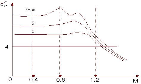 у треугольного крыла с дозвуковыми передними кромками получается меньше, чем у крыла бесконечного размаха, и падает с ростом числа М.