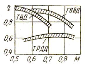 Как было уже указано, в диапазоне чисел М=0,75...0,8 наиболее эффективны ТВВД (рис.4.13). Для практического применения винтовентиляторов необходимо решение ряда проблем, возникающих в связи с необходимостью обеспечить нормативные требования по шуму и вибрациям в самолете, с раз- работкой технологии изготовления лопастей из композиционных материалов, систем автоматического управления углом установки лопастей при внезапных отказах двигателей и др.