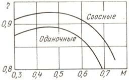 Ограничение по частоте вращения винта требует большой редукции оборотов свободной турбины ТВД, что приводит к конструктивным трудностям, росту массы редуктора и т. п. Можно также увеличивать снимаемую мощность (коэффициент р) за счет увеличения количества лопастей и их хорды (ширины), однако это приводит к увеличению взаимного влияния лопастей и соответствующему росту сопротивления. Коэффициент η начинает уменьшаться, что невыгодно, так как тяга винта падает, несмотря на увеличение снимаемой мощности.