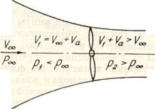 Рассмотрим физическую природу этого явления. Для этого изучим изменение параметров потока в струе, проходящей через винт (рис.4.20). Вдали от плоскости вращения винта скорость V