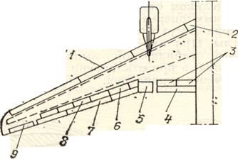 На рис. 5.3 показан пример размещения некоторых органов механизации на крыле летательного аппарата: 1 — секции предкрылка; 2 — щиток Крюгера; 3 — воздушные тормоза; 4— двухщелевые закрылки (внутренняя секция); 5 — элевоны; б- интерцепторы (воздушные тормоза); 7 — двухщелевые закрылки; 8 — интерцепторы (гасители подъемной силы и воздушные за); 9 — внешние элероны.
