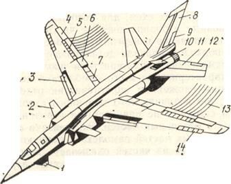 На рис. 5.6 показано возможное расположение некоторых органов управления на гипотетическом летательном аппарате: 1 — переднее (дополнительное) вертикальное оперение (декиль); 2 — переднее (дополнительное) горизонтальное оперение; 3 — предкрылки; 4 — внешние элероны; 5 — спойлеры; б — внутренние элероны; 7 — элероны-закрылки (флапероны); б — руль направления; 9 — триммер руля направления; 10-тормозные щитки; 11 — руль высоты; 12 — триммер руля высоты; 13 — струйный закрылок; 14 — отклоняемые секции носка.