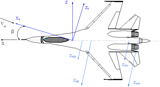 Сила Zа создается всеми частями самолета: крылом, фюзеляжем, вертикальным и горизонтальным оперением, подвесками и т.д.