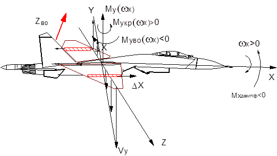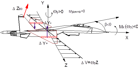 При вращении ЛА относительно оси OY кроме МУдемпф    возникает  спиральный момент крена за счёт возникновения в сечениях крыла дополнительных скоростей   DV= wYz. При wY>0  на правой консоли скорости обтекания увеличиваются и увеличивается подъемная сила, на левой – наоборот. В результате появляется момент Мx(wy), стремящийся накренить ЛА в сторону отстающего крыла, т.е. отрицательного по знаку.  Этот момент  способствует в входу ЛА  в движение по спирали.