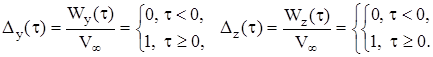 В случае подхода  к ЛА фронта слабой ударной волны с любого направления при произвольном распределении в пространстве за ударной волной возмущенных скоростей Wz и Wy аэродинамические характеристики аппарата определяют с помощью интеграла Дюамеля. При этом предварительно получают переходные функции характеристик как реакции на единичные