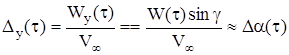 При попадании ЛА в восходящий поток воздуха, имеющий скорость Wy , у него увеличивается угол атаки на величину   , что вызывает приращение подъёмной силы   .