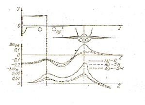 Анализ зависимостей  суа  (z) и   mx (z) показывает , что наиболее сильное воздействие спутного следа происходит в центре вихревого жгута, сходящего с конца крыла .