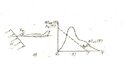 Например, если ударная волна набегает на самолет снизу опереди под углом g  к его продольной оси (рис.8.9), и закон  изменения относительных вертикальных скоростей   (за фронтом  ударной волны)  показан на графике штриховой линией, то изменение по времени коэффициента подъемной силы , рассчитанное рассмотренным способом, существенно отличается от закона изменения кинематического параметра  .