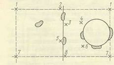 После обработки сигналы ЛЭ подают на экран ЭЛТ, на котором одновременно представлена развертка, соответствующая поверхности изделия, и показано расположение на ней преобразователей. Источник сигналов АЭ появляется на экране в виде светящейся точки. Таким образом, получается картина сигналов, подобная показанной на рис. 5. Кроме того, на экране дисплея иногда изображают амплитудное, временное или частотное распределение сигналов.