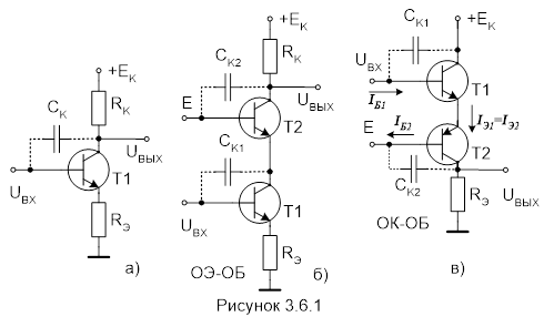 На рис. 3.6.1 -в приведена каскодная схема ОК-ОБ. Она применяется в составе АИС тогда, когда постоянный уровень выходного напряжения должен быть ниже уровня входного напряжения для обеспечения непосредственной вязи с последующими каскадами. Транзистор Т1 включен по схеме ОК, а транзистор Т2 - по схеме ОБ. Включение Т2 по схеме ОБ позволяет исключить обратную связь через емкость СК2 между выходом и входом усилителя, что расширяет полосу пропускания и препятствует самовозбуждению. Транзистор Т1, включенный по схеме ОК, обеспечивает большое входное сопротивление.