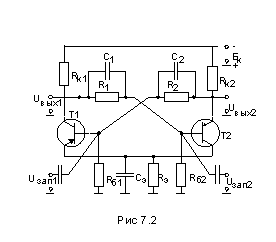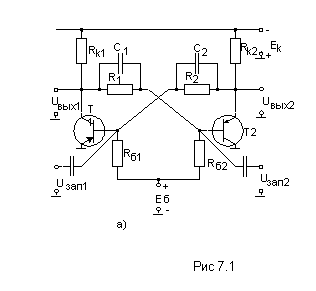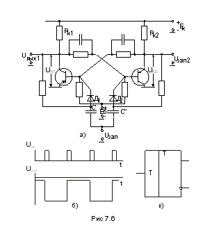 Временные диаграммы переключающих импульсов и импульсов, формируемых на коллекторах транзисторов, приведены на рис. 7.1,б. Здесь и далее импульсы на временных диаграммах изображены идеальными: длительность фронтов принята равной нулю.