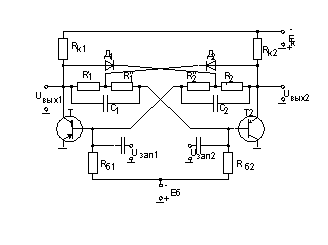 Каждое верхнее по схеме плечо цепи связи составляется двумя резисторами (R'1, R"1 и R'1 R"2), к точке соединения которых подключен катод диода. При этом если отпирается, а Т2 запирается, то катод диода окажется более отрицательным, чем база Т1. В результате диод откроется раньше, чем напряжение коллектор – база Т1 окажется положительным, т. е. насыщение Т1 будет устранено. Аналогично будет открываться диод Д2 при отпирании транзистора Т2 и запирании транзистора Т1.
