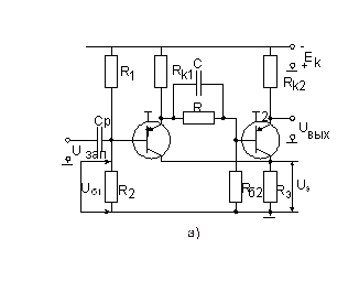 Несимметричный триггер с эмиттерной связью (триггер Шмитта). Схема такого триггера приведена на рис. 7.4, а. Здесь перепады напряжения с левого плеча на правое передаются, как обычно, через делитель R –R62, а с правого на левое плечо – через общий резистор Rэ в цепи обоих эмиттеров. Шунтировать этот резистор конденсатором нельзя; в противном случае напряжение на Rэ не сможет быстро изменяться. Конденсатор С является ускоряющим. Делитель R1–R2 обеспечивает необходимый режим работы транзистора Т