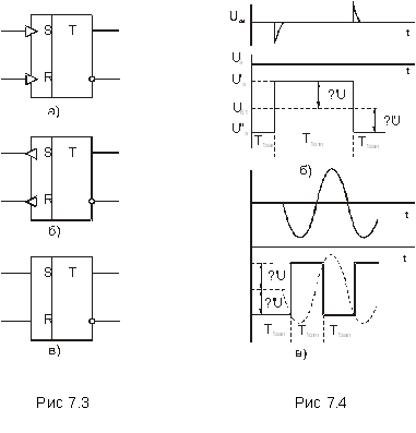 Если переключение триггера осуществляется установившимся уровнем запускающего сигнала (т. е. требует большой длительности сигнала), то входы триггера называют статическими и на условном изображении треугольником их не отмечают (рис. 7.3, в).