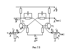 Триггер с раздельным запуском, в цепях которого установлены дифференцирующие цепи (С1R1 и С2R2), изображен на рис. 7.5.