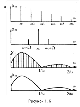 В общем случае сумма (1.1) является бесконечным рядом. Но в действительности для всех сигналов число членов ряда, а следовательно, и число спектральных линий конечно, так как амплитуды гармоник, начиная с некоторого номера, становятся настолько малы, что ими можно пренебречь, не нарушая смысла сообщения. Таким образом, сигналы в системе управления и связи практически всегда представляются функциями с ограниченным спектром.