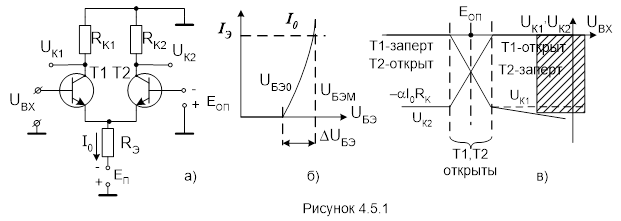 Если принять аппроксимацию входной характеристики транзисторов, как показано на рисунке 4.5.1-б, то для полного переключения тока I0 из одного плеча в другое достаточно уменьшить напряжение UБЭ у открытого транзистора на величину ∆UБЭ, а у закрытого - увеличить на ∆UБЭ. Следовательно, ширина активного участка передаточных характеристик (области переключения) дифференциального каскада (рис. 4.5.1- в) составляет 2∆UБЭ (порядка 0,2...0,ЗВ). При UВХ ≤ ЕОП - ∆UБЭ транзистор T1 закрыт, а Т2 открыт, напряжение UК1 = 0, UК2 = -α I0RК.При UВХ. ≥ Е0П + ∆UБЭ T1 открыт, а Т2 закрыт, соответственно UК1 ≈- -α I0RК, UК2 = 0, Заметим, что в последнем случае при увеличении UВХ напряжение UК1 продолжает несколько спадать и после переключения транзисторов. Однако спад невелик, так как коэффициент передачи каскада ОЭ на транзисторе T1 с эмиттерной нагрузкой RЭ, равный примерно RК/RЭ, значительно меньше единицы. Дальнейшее увеличение UВХ может привести к насыщению транзистора T1. Если принять условие насыщения UБК ≥ 0, то на высокий уровень входного напряжения необходимо наложить ограничение: