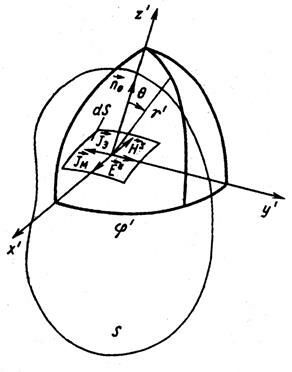 Разобьем поверхность S на элементарные площадки dS, тогда, рассматривая каждую площадку как совокупность двух элементарных излучателей – электрического и магнитного, можно найти полное поле во внешней области, суммируя поля, созданные отдельными элементами. Обычно учитывают токи только на части замкнутой поверхности S, где они наиболее существенны, причем эту часть поверхности выбирают совпадающей с фронтом волны, излучаемой антенной. В данном случае каждую элементарную площадку можно рассматривать как элемент волнового фронта – элемент Гюйгенса, электрическое поле которого и локальной системе координат r', q', j', связанной с декартовой системой x', у', z', ось z' которой совпадает с внешней нормалью
