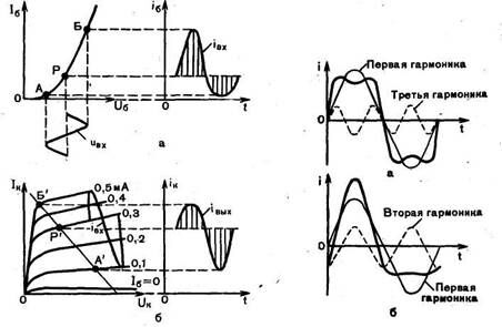 Рис. 3. Нелинейные искажения: а - из-за нелинейности входной характеристики транзистора; б — из-за неравномерности семейства выходных характеристик