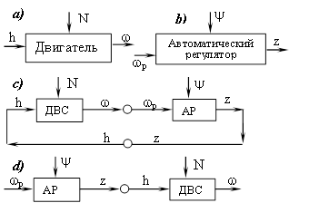 Рис.1.1. Функциональные схемы: а) двигателя; b) регулятора c) системы регулирования d) системы управления