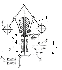 Для решения этой задачи используется автоматический регулятор, воспринимающий воздействие со стороны двигателя в виде изменения угловой скорости ωр валика 1 (см. рис. 1.1,b; и 1.2). Следовательно, для двигателя ωр - выходная координата (стрелка от двигателя, см. рис. 1.1,а), а для автоматического регулятора ωр - входная координата (рис. 1.1,b). Значение ωр определяет положение z муфты 3 и положение h органа управления 5 двигателем (см. рис. 1.1,b и 1.2). Таким образом, положение z муфты - выходная координата регулятора. Во многих случаях регулятор дает возможность устанавливать желаемый скоростной режим или изменять его путем смены настройки ψ регулятора, поэтому ψ также является внешним воздействием - входной координатой регулятора (см. рис. 1.1,b).