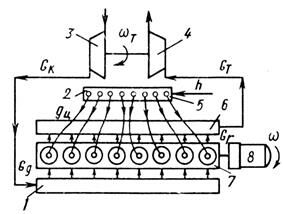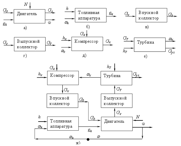 Входными координатами компрессора (рис. 1.5,д) являются ωк - угловая скорость ротора турбокомпрессора, Ga - количество воздуха, поступающего из подводящего патрубка с воздушным фильтром и hк - положение органа управления (при регулируемом турбонаддуве). Выходной координатой является подача воздуха Gк в единицу времени во впускной коллектор. Для турбины (рис. 1.5,е) поступление газа GT из выпускного коллектора в единицу времени и hT - положение органа управления турбиной (при регулируемом турбонаддуве) - входные координаты, а ωк и Gyx - количество таза, уходящего из турбины в единицу времени - выходные координаты. При свободном входе воздуха в компрессор и выпуске газа из турбины координаты Ga и Gyx в функциональных схемах не учитываются. Совокупность функциональных ' схем элементов (рис. 1.5,а - е) дает возможность составить функциональную схему комбинированного двигателя в целом. На рис. 1.5,ж показана такая схема для дизеля с автономным турбокомпрессором (см. рис. 1.4).