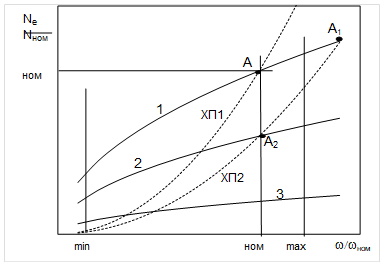 Рис 1.6 Совмещенные характеристики двигателя и потребителя. 1 - внешняя скоростная характеристика двигателя; 2 - частичная скоростная характеристика двигателя; 3 – характеристика холостого хода; ХП1 , ХП2 – характеристики потребителя; А , А1 , А2 – точки установившихся (равновесных) режимов; min, ном, max – линии минимальных, номинальных и максимальных режимов (соответственно)
