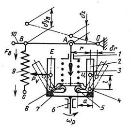Рис. 4.1 Схема механического чувствительного элемента (предельный регулятор). 1 – опорная тарелка; 2 – груз; 3 – пружина соосная с муфтой; 4 – ось поворота груза; 5 – лапка; 6 – валик регулятора; 7 – траверса; 8 – муфта; 9 – пружина; 10 - рычаг
