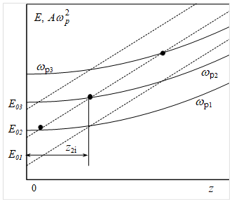 Рис. 4.2 Определение равновесных положений муфты zoi при различных угловых скоростях ωрi по характеристикам сил: ― поддерживающей; - - - восстанавливающей; ● – точки равновесия (E02, ωpi); z2i – равновесное положение муфты в точках равновесия.