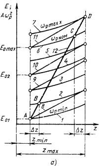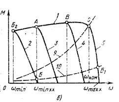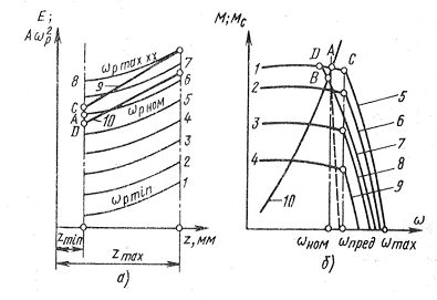 ; 9 – E = f(z); при предельном регуляторе; 10 - E = f(z) при прецизионном регуляторе); б – двигателя (1 – внешняя скоростная; 2…4 –частичные скоростные; 5…9 – регуляторные) 10 - потребителя