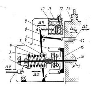 Рис. 4.4 Схема прецизионного регулятора: 1,8 – тяги; 2,7 – рычаги; 3 – тарелка; 4,9 – пружины; 5 – муфта; 6 – груз; 10 – поршень; 11 – катаракт; 12 – игла; 13 – топливный насос; 14 – рейка; 15 - траверса; 16 – кулачковый валик.