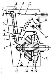 1, 11 – рычаги; 2 – маслоподводящий щиток; 3 – винт регулировки степени неравномерности; 4 – хомутик; 5 – пружина; 6 – планка; 7 – чашка; 8 – пробка; 9, 10 – тяги к рейки топливного насоса; 12 – упор; 13 – коническая тарелка; 14 – груз; 15 – траверса; 16 – упорный диск; 17 - муфта