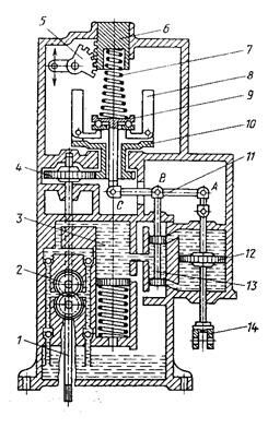 Рис. 4.7 Схема автоматического регулятора непрямого действия с жесткой обратной связью: 1 – приводной валик; 2 – масляный насос ; 3 – масляный аккумулятор; 4 – зубчатое колесо; 5 – сектор изменения предварительной деформации пружины; 6 – опора пружины; 7 – пружина; 8 – груз; 9 – муфта; 10 – траверса; 11 – рычаг жесткой обратной связи; 12 – поршень; 13 – золотник; 14 - шток