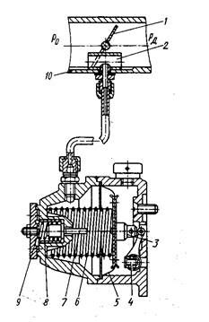 Рис. 5.1 Схема всережимного пневматического регулятора: 1 – дроссельная заслонка; 2- патрубок; 3 – муфта; 4 – рычаг переключения; 5 – диафрагма; 6, 8 – пружины; 7 – упор; 9 – стакан; 10 – впускной коллектор