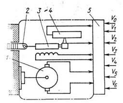 1 - генератор постоянных импульсов; 2- сумматор; 3 - усилитель; 4 - исполнительный элемент (электромагнит); 5 - чувствительный элемент частоты вращения; 6 - ждущий мультивибратор; 7 - индуктивный датчик; 8 - задатчик