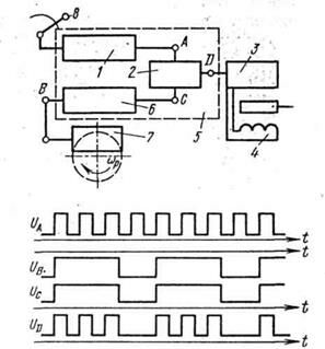 В качестве датчиков в регуляторах могут использоваться также различные электронные устройства. На рис. 5.7 показана функциональная схема одного из таких устройств, предназначенного для измерения частоты вращения. Устройство состоит из генератора 1, вырабатывающего положительные постоянные импульсы uА, поступающие на вход сумматора 2. На второй вход сумматора подаются выходные импульсы ждущего мультивибратора 6, сформированные в результате взаимодействия его с индуктивным датчиком 7 частоты вращения коленчатого вала. Датчик вырабатывает отрицательные импульсы ив, число которых определяется частотой вращения коленчатого вала. В самом мультивибраторе 6 формируются положительные импульсы ис, причем число импульсов ив индуктивного датчика 7 определяет ширину выходного положительного импульса ис. Чем больше импульсов ис датчика (чем больше частота вращения коленчатого вала), тем уже выходной импульс мультивибратора.