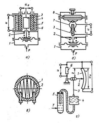 Рис. 5.8. Датчики: а - избыточного давления; б -абсолютного давления (1 – диафрагменная коробка; 2 - пружина; 3 - якорь (резистор); 4, 5, 6 - обмотки; 7 - ползунок; 8 - анероид); в - температуры воздуха во впускном коллекторе (1 - проволока; 2 - текстолитовый корпус); г - температуры охлаждающей воды (1 - потенциометр; 2 - ползунок; 3 - шток; 4 - сильфон; 5 - термобаллон; 6 - резистор)