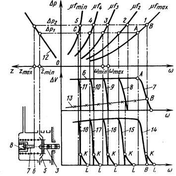 Разрежение Δр1 создает на диафрагме 5 (рис. Р5.2, б) чувствительного элемента усилие, которое при равновесном ее положении равно усилию предварительной деформации пружины 6 регулятора. Следовательно, при всех разрежениях, равных или меньших Δр1, муфта 3 регулятора находится в крайнем правом положении и поддерживает рейку топливного насоса на упоре полной подачи топлива (кривая 6 на рис. 5.2, а). По мере увеличения разрежения Δр > Δр1 диафрагма перемещается влево, деформируя пружину 6 регулятора (связь разрежения Δр с перемещением z муфты регулятора представлена кривой 12). Рейка при этом перемещается в сторону выключения подачи топлива, причем угловая скорость вала, при которой начинается деформация пружины, определяется положением дроссельной заслонки чем больше она открыта, тем при большей угловой скорости начинается уменьшение подачи топлива и достигается разрежение Δр2, при котором подача топлива прекращается (кривые 1-5)
