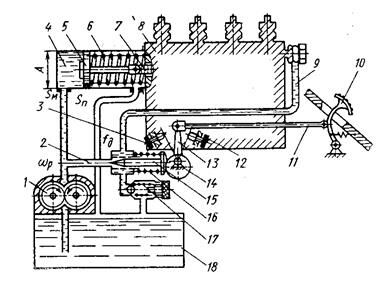 Гидравлические регуляторы. В гидравлическом регуляторе прямого действия (рис. 5.3) в качестве рабочего тела может быть использовано машинное масло или топливо. Топливо насосом 1 подается в цилиндр 4. Избыток его через дросселирующую иглу 15 и перепускной клапан 17 сливается в бак 18.