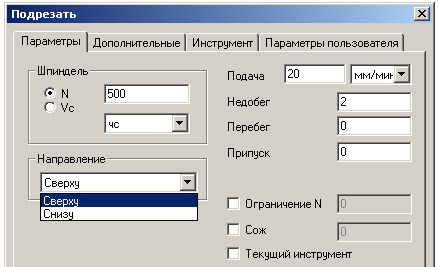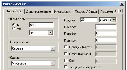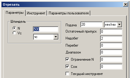 В группе Ограничение N – максимальное число оборотов (об/мин) шпинделя. Параметр необходим для ограничения числа оборотов в процессе снятия материала, так как при уменьшении диаметра обрабатываемой детали количество оборотов шпинделя за единицу времени возрастает.