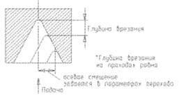 Смещение – получение резьбы методом смещенной подачи. Если смещение в переходе установили в «0», то система автоматически рассчитывает смещения на проходах для угла 60°. Расчет ведется из условия равенства снимаемого металла на проходах. При нарезании резьбы слева процессор также автоматически рассчитывает смещение на проходах – в данном случае величину смещения нужно установить в «–100».
