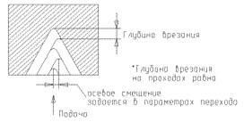В группе Врезание указываются: Подача – подача, на которой происходит врезание; Длинна – длинна врезания; Разбежка - параметр определяющий "разгруженное" врезание на первом проходе при прорезке. Врезание на первом проходе происходит на глубину резания. Затем инструмент смещается от контура на ту же величину и снова углубляется две глубины резания. Тип врезания повторяется на всю глубину прорезки.