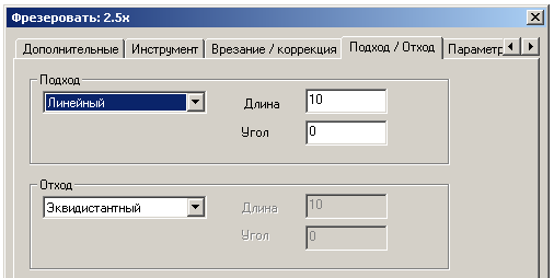 Линейный - Движение к точке начала обработки контура по прямой под определенным углом к контуру. Для подхода к контуру по прямой под заданным углом, необходимо задать длину перемещения подхода.