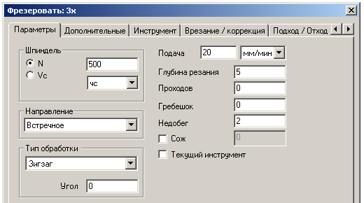 Зигзаг — обработка во взаимопараллельных плоскостях перпендикулярных плоскости XY с чередованием встречного и попутного направления фрезерования. Направление обработки (расположение плоскостей) задается параметром Угол, который определяет угол разворота плоскостей от оси X в градусах. Шаг между плоскостями обработки задается параметром Гл.рез..