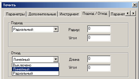 Радиальный - Подход к контуру по дуге заданного радиуса. Для задания радиусного подхода, необходимо задать радиус дуги подхода и центральный угол.
