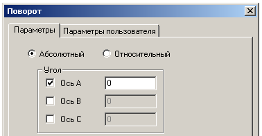 Команда Поворот задает угол поворота оси шпинделя вокруг одной, двух или трех (одновременно) осей вращения текущей системы координат детали. В зависимости от типа станка поворот обеспечивается, либо за счет поворота детали относительно оси шпинделя, либо за счет поворота оси шпинделя относительно детали.