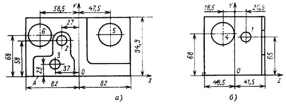 В соответствии с принятой схемой базирования для каждой установки детали выбирают систему начала отсчета (ноль детали). Например, для стороны I – это координатная система XOY, для стороны II – координатная система YOZ. Относительно этих координатных систем производят пересчет всех размеров, определяющих положение обрабатываемых поверхностей заготовки, как показано на рис. 5.