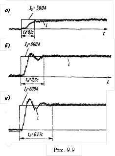 Особенности синтеза контура регулирования тока якоря. Традиционно в системах регулирования тока двигателей применяют ПИ-регуляторы. САР ЭПС с таким регулятором обеспечивают удовлетворительное качество переходных процессов (рис. 9.9а и б). Однако при больших скачках задающего воздействия в системе возникают переходные процессы со значительным перерегулированием. Так, из рис. 9.9в видно, что даже после выполнения процедуры оптимизации параметров регулятора при скачке задающего воздействия на 800 А возникает переходный процесс со значительным перерегулированием до σ= 20 %. Такой высокий уровень перерегулирования нежелателен для ЭПС, поэтому применение ПИ-регулятора целесообразно лишь при малых скачках задающего воздействия.