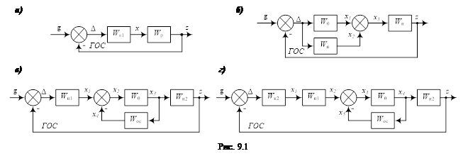 Для повышения качества комбинированных систем регулирования корректирующие звенья можно включать в цепь задающих и возмущающих воздействий (рис. 9.2). Они могут оказывать влияние на качество регулирования только по тем цепям, к которым подключены (g или q). Устранить влияние других воздействий можно только корректирующими звеньями, включенными в замкнутый контур САР. Коррекция по внешним воздействиям не влияет на устойчивость системы.
